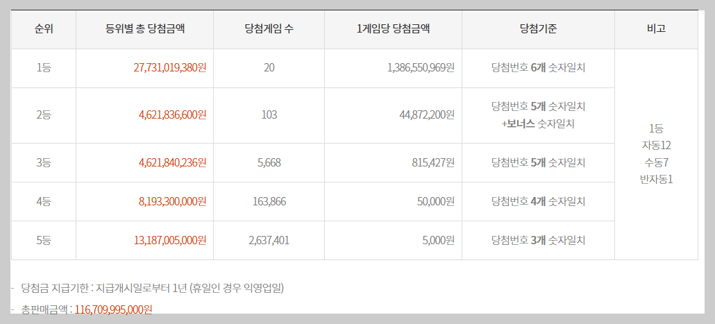 이번 회차는 무려 20명이 1등에 당첨되면서 각자 13억 8,655만 원씩 당첨금을 받게 되었습니다.