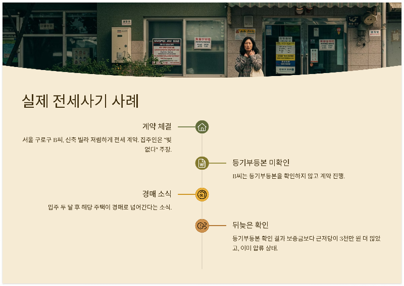 서울 구로구에 거주하던 B씨는 신축 빌라를 저렴하게 전세로 계약했어요. 계약 당시 집주인이 “빚은 없어요. 바로 들어오셔도 돼요”라고 말했지만, B씨는 등기부등본을 확인하지 않았어요.