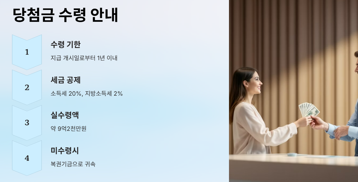 • 당첨금 수령 기한: 지급 개시일로부터 1년 이내에 꼭 수령해야 해요. (휴일이면 다음 영업일까지 가능)