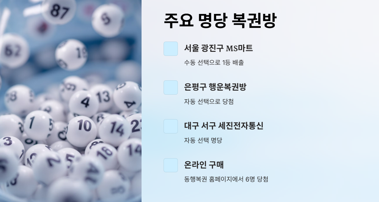 이번 회차에서는 서울, 대구, 경기 등 여러 지역에서 당첨자가 나왔어요. 그리고 요즘 눈여겨볼 만한 점은 온라인 구매자도 6명이 1등에 당첨됐다는 사실이에요.