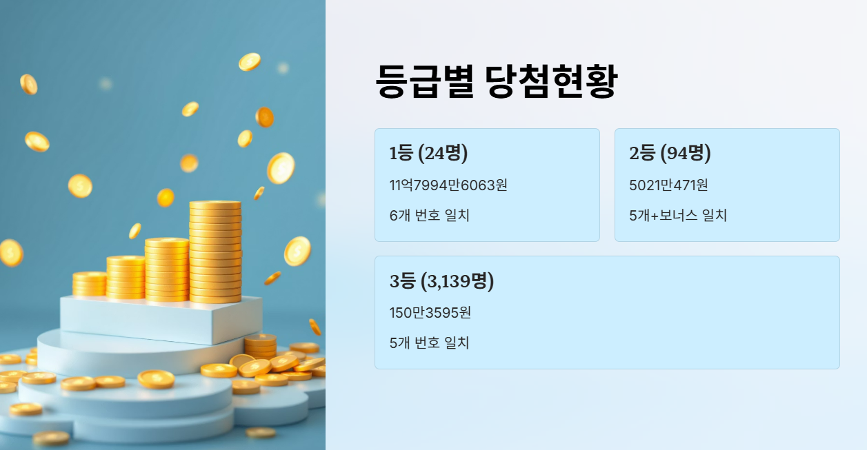 1등 당첨자는 24명, 각자 약 11억 7,994만 원씩 받아가게 되었고요. 2등은 94명으로 약 5,021만 원씩, 3등은 3,139명으로 1인당 약 150만 원을 받습니다. 4등과 5등 당첨자는 각각 5만 원, 5천 원의 고정 금액을 수령하게 됩니다.