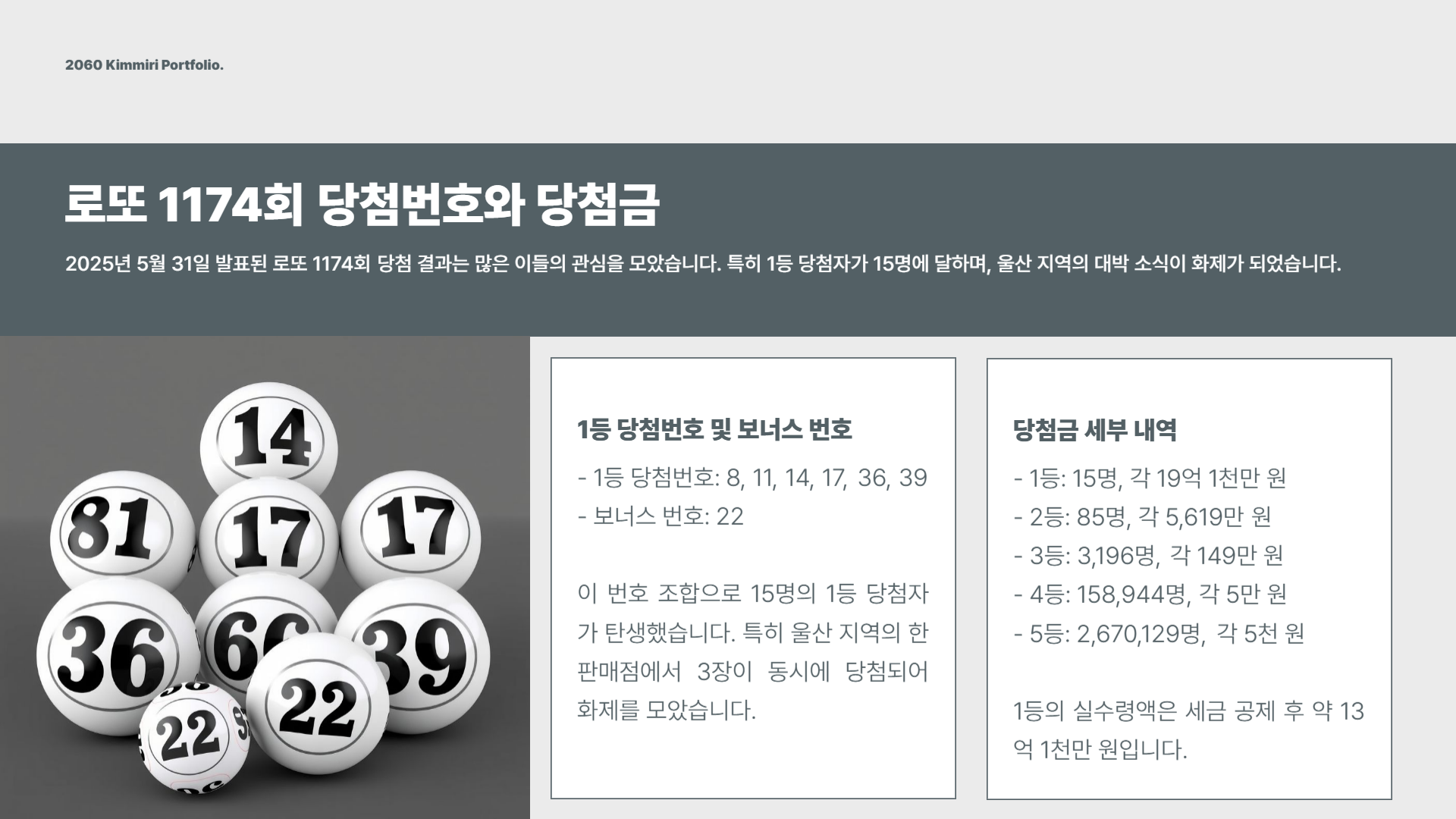 이번 로또1174회차는 ‘울산’과 ‘수동 구매’의 승리로 기억될 것 같습니다.