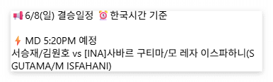 • 대진: 서승재·김원호(대한민국, 랭킹 5위) vs 사바르 구티마·모 레자 이스파하니(인도네시아, 랭킹 8위)