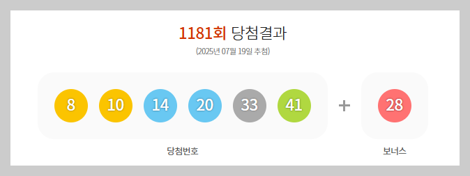 1181회 당첨결과 (2025년 07월 19일 추첨) 당첨번호 8 10 14 20 33 41 1181회 순위별 등위별 총 당첨금액, 당첨게임 수, 1게임당 당첨금액, 당첨기준, 비고 안내 순위 등위별 총 당첨금액 당첨게임 수 1게임