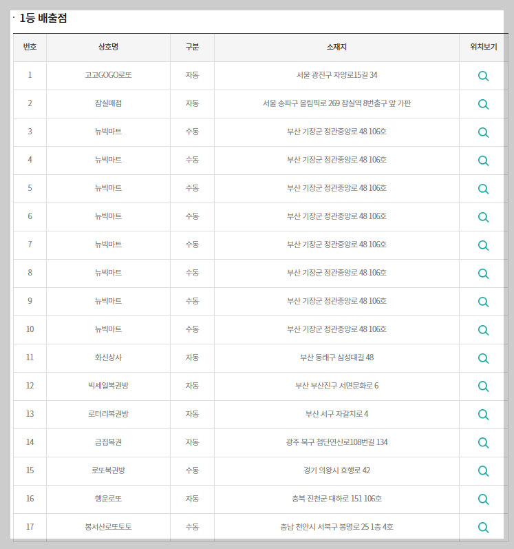 자동 당첨은 서울, 광주, 충북 등에서 나왔고, 수동 당첨은 대부분 부산과 경기, 충남에서 발생했습니다. 역시 부산의 '뉴빅마트'가 이번 회차의 주인공임은 분명하네요!