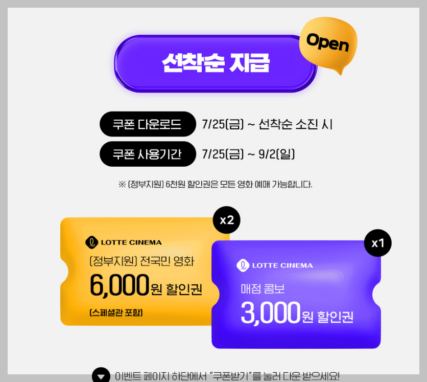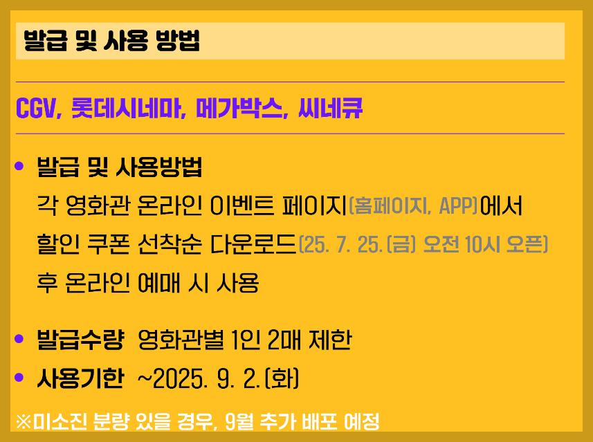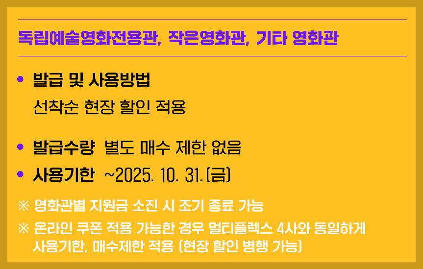 일부 영화관은 시스템상 온라인 쿠폰 발급이 어려워 현장에서 선착순 할인 적용 방식으로 운영됩니다.
