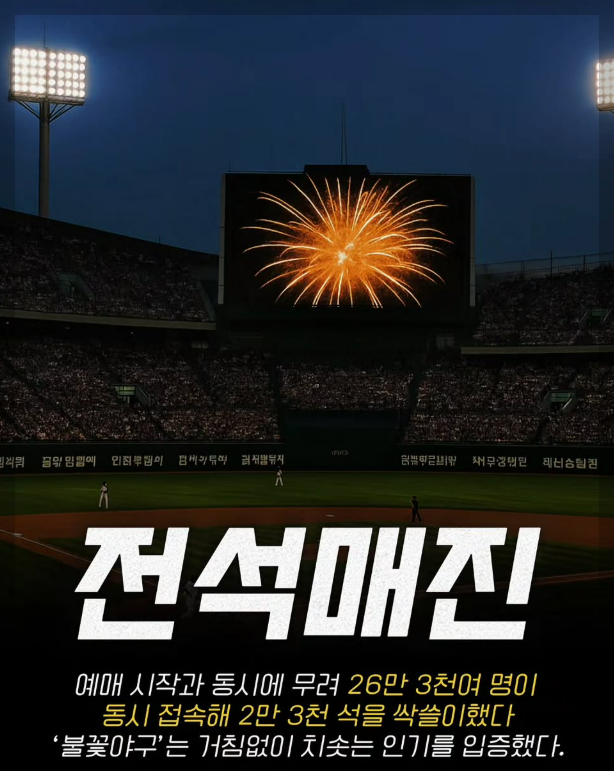 '불꽃야구'의 인기는 정말 대단합니다. 이번 부산 직관 경기는 예매 시작 단 11분 만에 2만 3천 석 전석이 매진되는 기록을 세웠어요. 동시 접속자 수가 무려 26만 명에 달했다고 하니, 그야말로 뜨거운 감자라고 할 수 있죠.