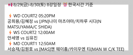 | 여자단식 | 안세영 vs 심유진 | - | 8/30(토) 00:00 |