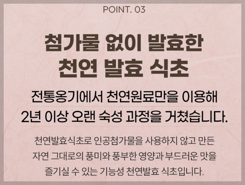 - 부드러운 풍미: 오랜 자연 숙성 덕분에 자극적인 신맛 대신 부드럽고 은은한 풍미가 특징입니다.
