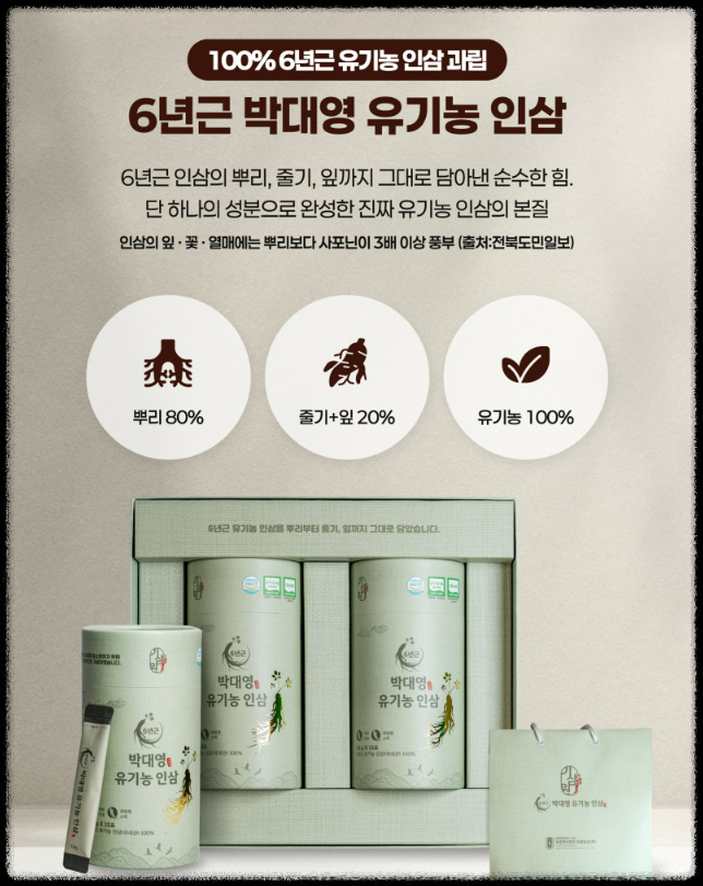 - 어르신 건강 선물: 40년 장인이 키운 유기농 인삼이라는 스토리가 더해져, 명절이나 생신 선물로 드리기에도 좋습니다.
