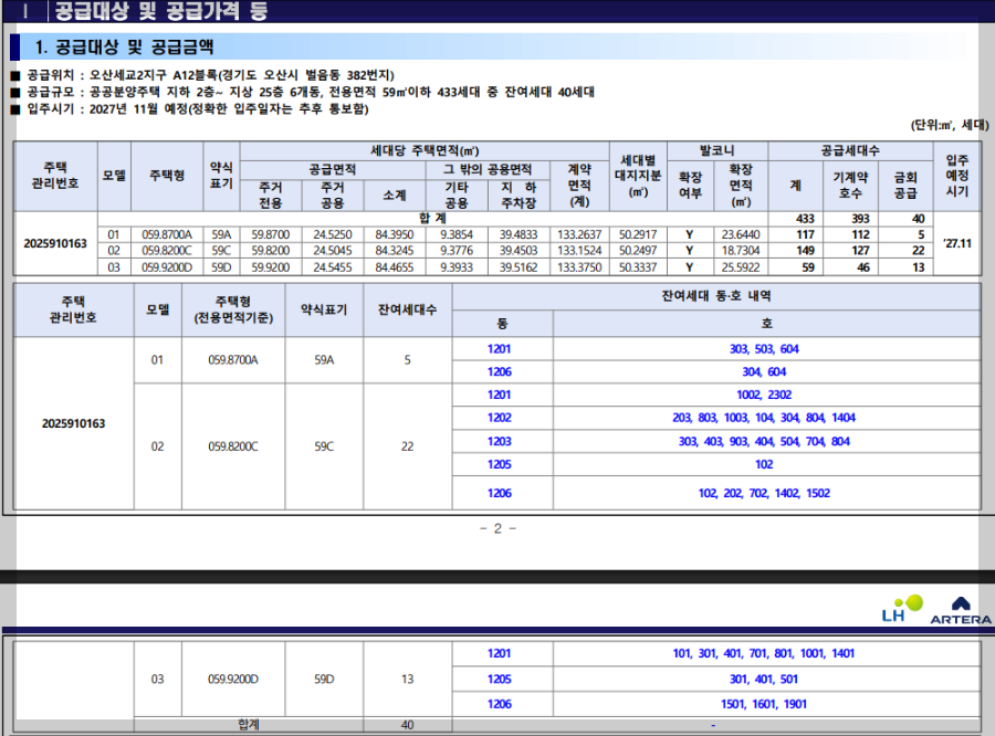 오산 세교 아테라는 경기도 오산시 벌음동에 위치한 공공분양주택입니다. 총 433세대 중 40세대가 무순위 청약으로 나오며, 전용면적 59㎡ 단일 평형으로 공급됩니다.