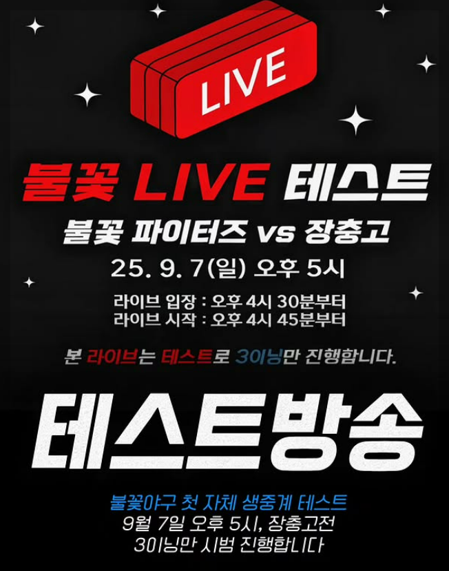 9월 7일 일요일 오후 5시, 대전 '파이터즈파크'에서 열린 불꽃파이터즈와 장충고의 경기를 통해 첫 번째 불꽃 라이브가 진행되었습니다.