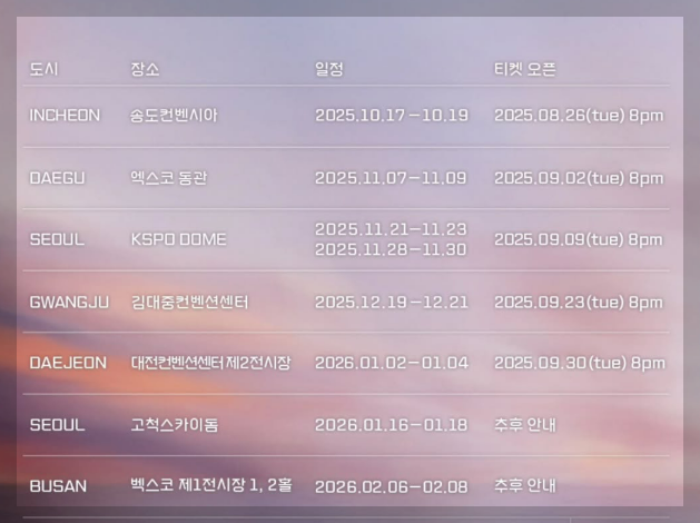 | 서울 | KSPO DOME | 11.21(금) ~ 11.23(일)<br>11.28(금) ~ 11.30(일) | 09.09(화) 오후 8시 |