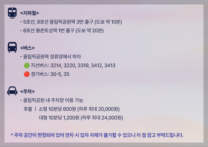 - 주차: 소형 차량 주차 시 10분당 600원의 요금이 부과됩니다. 가급적 대중교통 이용을 추천합니다.