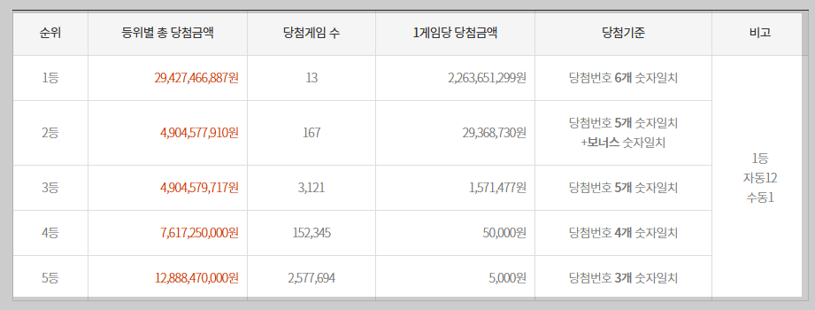 | 4등 | 152,345명 | 50,000원 | 비과세 | 50,000원 | 4개 숫자 일치 |