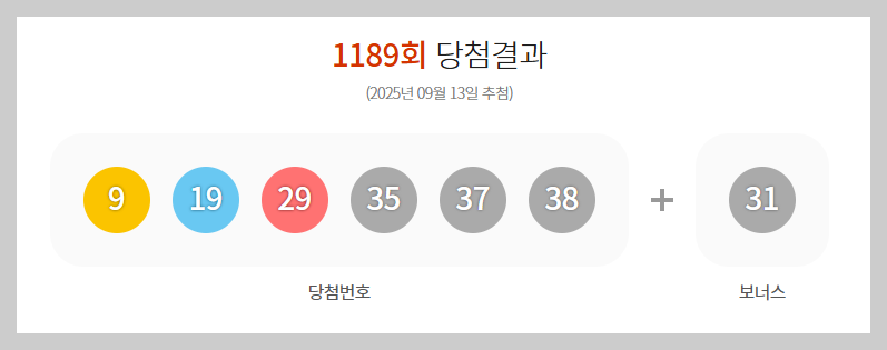 2025년 9월 13일 발표된 제1189회 로또 복권 추첨 결과, 1등 당첨 번호는 다음과 같습니다.