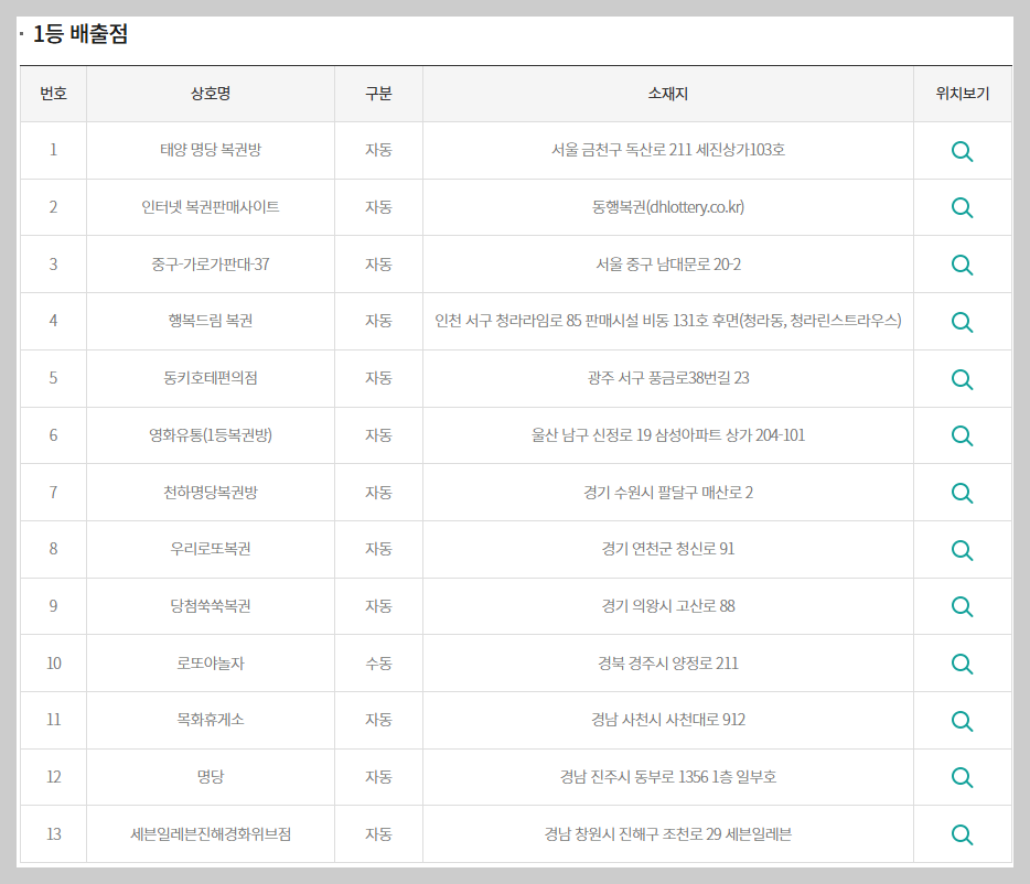 이번 회차에서 1등 당첨의 행운을 받은 판매점 리스트입니다.