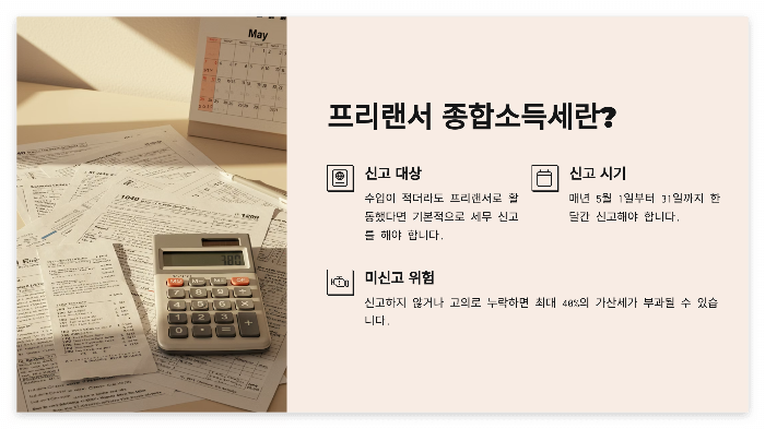 프리랜서로 일하다 보면 매년 5월마다 찾아오는 '종합소득세 신고'가 큰 숙제처럼 느껴지죠? 매출이 많지 않아도 신고 대상이 될 수 있고, 실수하면 가산세까지 붙을 수 있어서 꼭 제대로 알고 넘어가야 해요.
