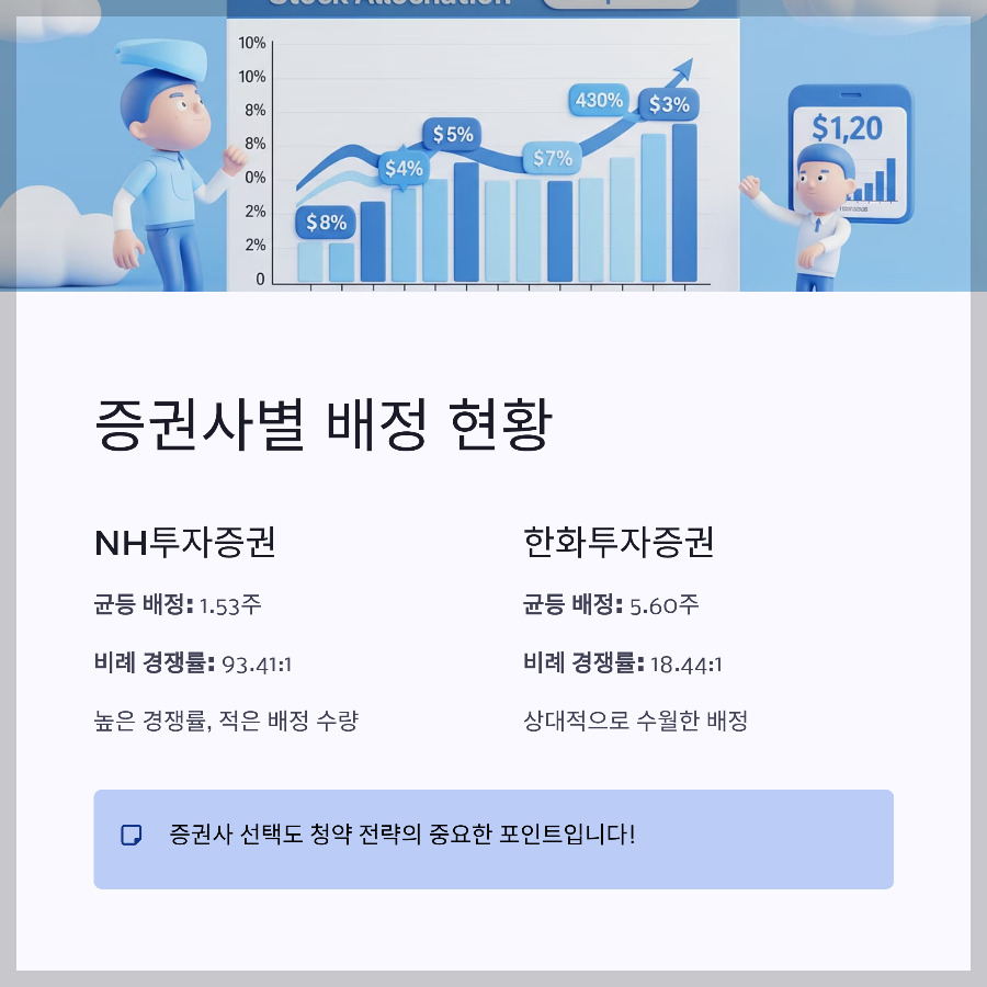 - NH투자증권: 균등 1.53주 / 비례 93.41:1 (경쟁 치열)